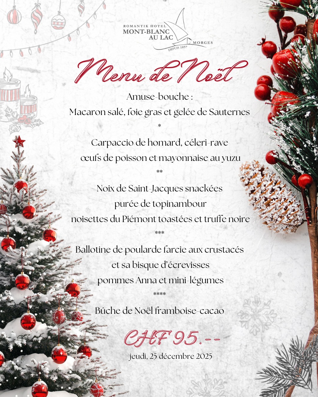 🎄 ҉ 𝙉𝙤ë𝙡 ҉ ҉ 𝙖𝙪 ҉ 𝙈𝙤𝙣𝙩-𝘽𝙡𝙖𝙣𝙘 ҉ 𝙖𝙪 ҉ 𝙇𝙖𝙘 ✨ Une table illuminée, un menu créé comme un écrin de gourmandise, et les lumières du port de Morges juste en face. Que vous célébriez à, en famille ou entre amis, la magie de Noël se déguste ici — dans la douceur du lac, la chaleur des plats et la beauté du moment. 🎄Offrez(-vous) ce moment pour une parenthèse enchantée. 🍽️ Menu de Noël – Jeudi 25 décembre 2025 📞 Réservations : +41 21 804 87 87 💌 info@hotel-mont-blanc.ch En direct sur notre site jusqu'à 4 personnes: hotel-mont-blanc.ch/restaurants 📍 Hôtel Mont-Blanc au Lac, Morges Faites-vous plaisir. Noël n’attend que vous. 🤍✨ Ouvrir sur Instagram