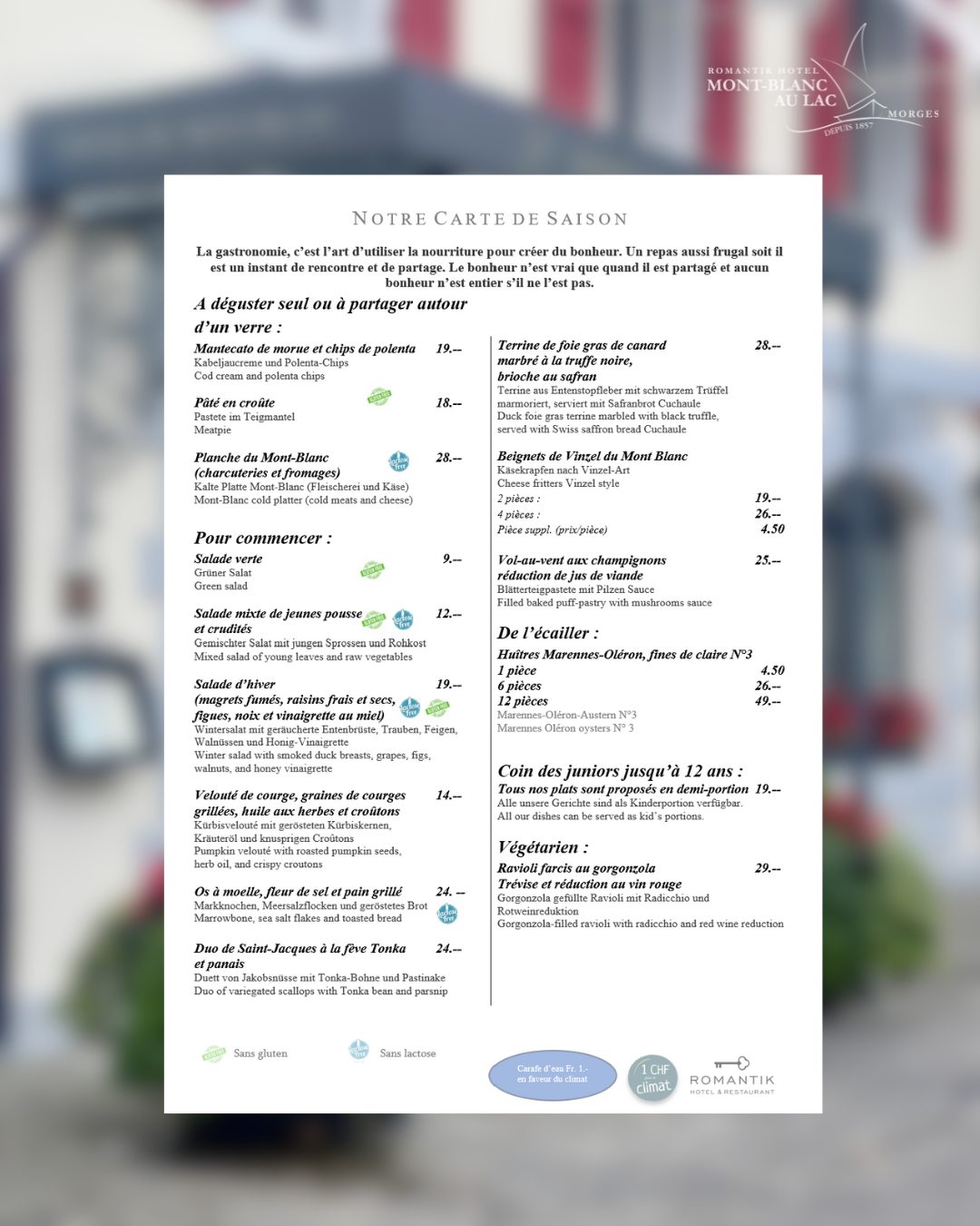 🍽️NOUVELLE CARTE DE SAISON 🍷 A vous qui aimez les plats gourmands, avec des produits de qualité, de terroir, à vous qui aimez vous arrêter au coeur de Morges pour un moment savoureux, agrémenté d'un bon vin s'il la faut: venez découvrir notre nouvelle carte de saison et les 2 menus à la carte. Nous nous réjouissons de vous accueillir au Pavois, au Rez ou au 1er. Pour vos réservations: ➡️ En un clic en ligne, facile et rapide: www.hotel-mont-blanc.ch/restaurants. 📞 021 804 87 87 📧 infor@hotel-mont-blanc.ch Toute l'équipe du Mont-Blanc au Lac Ouvrir sur Instagram