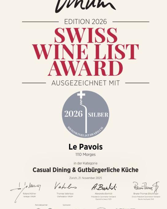 🎉 𝑼𝒏𝒆 𝒎𝒂𝒈𝒏𝒊𝒇𝒊𝒒𝒖𝒆 𝒏𝒐𝒖𝒗𝒆𝒍𝒍𝒆 𝒑𝒐𝒖𝒓 𝑳𝒆 𝑷𝒂𝒗𝒐𝒊𝒔 – 𝑯𝒐̂𝒕𝒆𝒍 𝑴𝒐𝒏𝒕-𝑩𝒍𝒂𝒏𝒄 𝒂𝒖 𝑳𝒂𝒄 ! 🍷 Nous sommes fiers d’annoncer que notre carte des vins a été distinguée au 𝗦𝗪𝗜𝗦𝗦 𝗪𝗜𝗡𝗘 𝗟𝗜𝗦𝗧 𝗔𝗪𝗔𝗥𝗗 𝟮𝟬𝟮𝟲 ! Un concours national organisé par @vinummagazin , sous le patronage de l’Association suisse des sommeliers SVS/ASSP. ✨ Cette année, plus de 180 cartes des vins ont été soumises dans quatre catégories : • Étoilés & Gourmets • Fine Dining / Haute Cuisine • Casual Dining / Cuisine traditionnelle • Design & Scène / Bar à vin Parmi toutes ces sélections d’exception, la nôtre a obtenu une médaille, faisant officiellement partie des meilleures cartes des vins de Suisse. Une belle reconnaissance pour notre engagement à mettre en valeur les trésors viticoles de notre pays, de manière passionnée depuis de longues années et à proposer une expérience mémorable réhaussée par la qualité des vins suisses exceptionnels. L'équipe du Pavois - Mont-Blanc au Lac.🍷 🍷 Rendez-vous au Restaurant Le Pavois pour découvrir (ou redécouvrir) notre carte primée ! Ouvrir sur Instagram