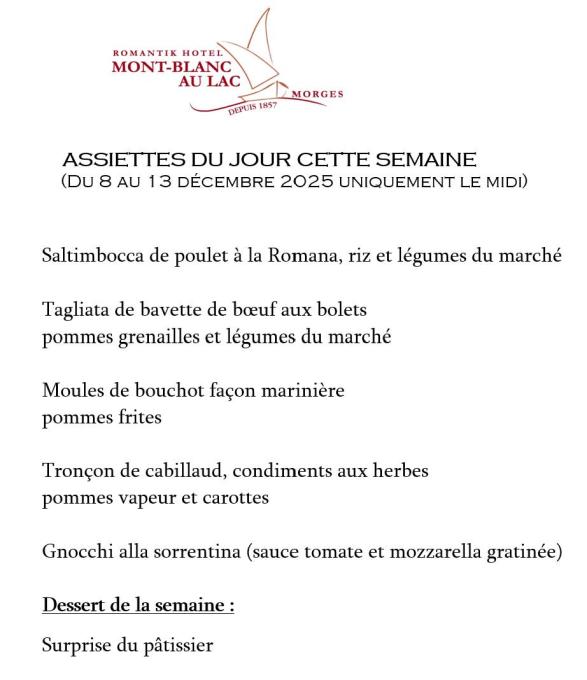🍷 🍽️ 𝓤𝓷 𝓫𝓸𝓷 𝓻𝓮𝓹𝓪𝓼 𝓭𝓮 𝓶𝓲𝓭𝓲 𝓪𝓾 𝓟𝓪𝓿𝓸𝓲𝓼 𝓪̀ 𝓜𝓸𝓻𝓰𝓮𝓼? 😊 Le restaurant «Le Pavois» vous présente une carte adaptée au gré des saisons faisant l’honneur à une cuisine raffinée de la région. Découvrez nos plats de saison et pensez à l'agrémenter d'un bon verre de vin, notre carte des vins est divine et fait la part belle aux producteurs d'exception de la région et d'ailleurs 🍷. ASSIETTES DU JOUR CETTE SEMAINE (du 8 au 13 décembre 2025 uniquement le midi) 🍽️ Saltimbocca de poulet à la Romana, riz et légumes du marché 24.-- 🍽️ Tagliata de bavette de bœuf aux bolets 29.-- pommes grenailles et légumes du marché 🍽️ Moules de bouchot façon marinière 22.-- pommes frites 🍽️ Tronçon de cabillaud, condiments aux herbes 26.-- pommes vapeur et carottes 🍽️ Gnocchi alla sorrentina (sauce tomate et mozzarella gratinée) 19.-- Dessert de la semaine : 🍧La surprise du pâtissier 10.-- ***** Et bien sûr: Nous travaillons avec des produits de qualité, avec une préférence pour les produits locaux ou régionaux. 🍷Et notre carte des vins riche, variée, pointue vous offre un vaste de choix pour agrémenter votre menu. **** Pour vos réservations: ➡️ 𝗘𝗻 𝗱𝗶𝗿𝗲𝗰𝘁 𝘀𝘂𝗿 𝗻𝗼𝘁𝗿𝗲 𝘀𝗶𝘁𝗲 𝗵𝘁𝘁𝗽𝘀://𝘄𝘄𝘄.𝗵𝗼𝘁𝗲𝗹-𝗺𝗼𝗻𝘁-𝗯𝗹𝗮𝗻𝗰.𝗰𝗵/𝗿𝗲𝘀𝘁𝗮𝘂𝗿𝗮𝗻𝘁𝘀 ou: 📞 021 804 8787 💌 info@hotel-mont-blanc.ch Ouvrir sur Instagram
