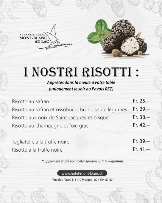 𝑰 𝒏𝒐𝒔𝒕𝒓𝒊 𝒓𝒊𝒔𝒐𝒕𝒕𝒊 & 𝒂𝒄𝒄𝒐𝒎𝒑𝒂𝒈𝒏𝒆𝒎𝒆𝒏𝒕 𝒅𝒆 𝒗𝒊𝒏 Ils sont de retour! Nos délicieux risotti concoctés par notre chef, toujours renouvelés, toujours délicieux! Un mets idéal pour les journées froides de décembre et janvier. 🍷Et nous vous proposons de compléter votre menu risotto avec un vin rouge à choix (Rosso di Luna ou un Merlot) de Angelo Delea, Losone. Pour vos réservations: ➡️ 𝗘𝗻 𝗱𝗶𝗿𝗲𝗰𝘁 𝘀𝘂𝗿 𝗻𝗼𝘁𝗿𝗲 𝘀𝗶𝘁𝗲 𝗵𝘁𝘁𝗽𝘀://𝘄𝘄𝘄.𝗵𝗼𝘁𝗲𝗹-𝗺𝗼𝗻𝘁-𝗯𝗹𝗮𝗻𝗰.𝗰𝗵/𝗿𝗲𝘀𝘁𝗮𝘂𝗿𝗮𝗻𝘁𝘀 ou: 📞 021 804 8787 💌 info@hotel-mont-blanc.ch Ouvrir sur Instagram